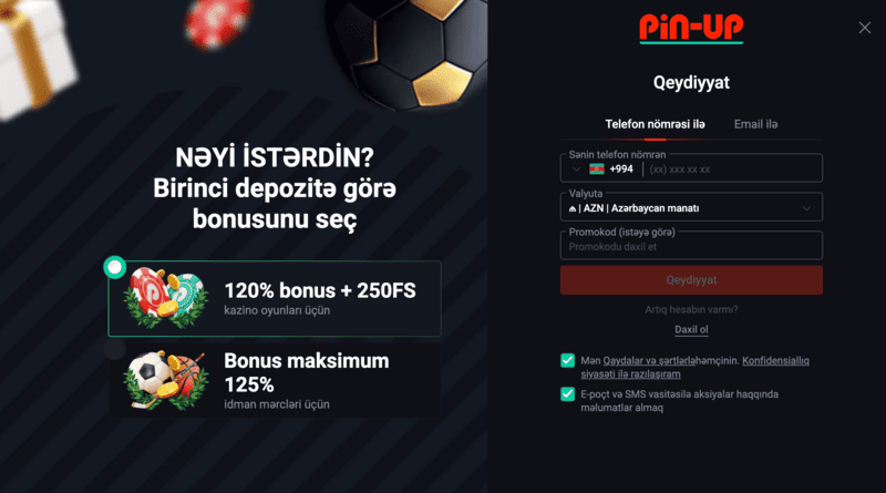 PinUp Azərbaycanda ilk dəfə qeydiyyatdan keçən hər bir istifadəçiyə xoş gəldin bonusu təqdim edir. Seçim yalnız bir dəfə mümkündür və iki bonus paketindən biri təklif olunur: kazino üçün 120% depozit bonusu və əlavə 250 frispin və ya idman mərcləri üçün 125%-ə qədər bonus.